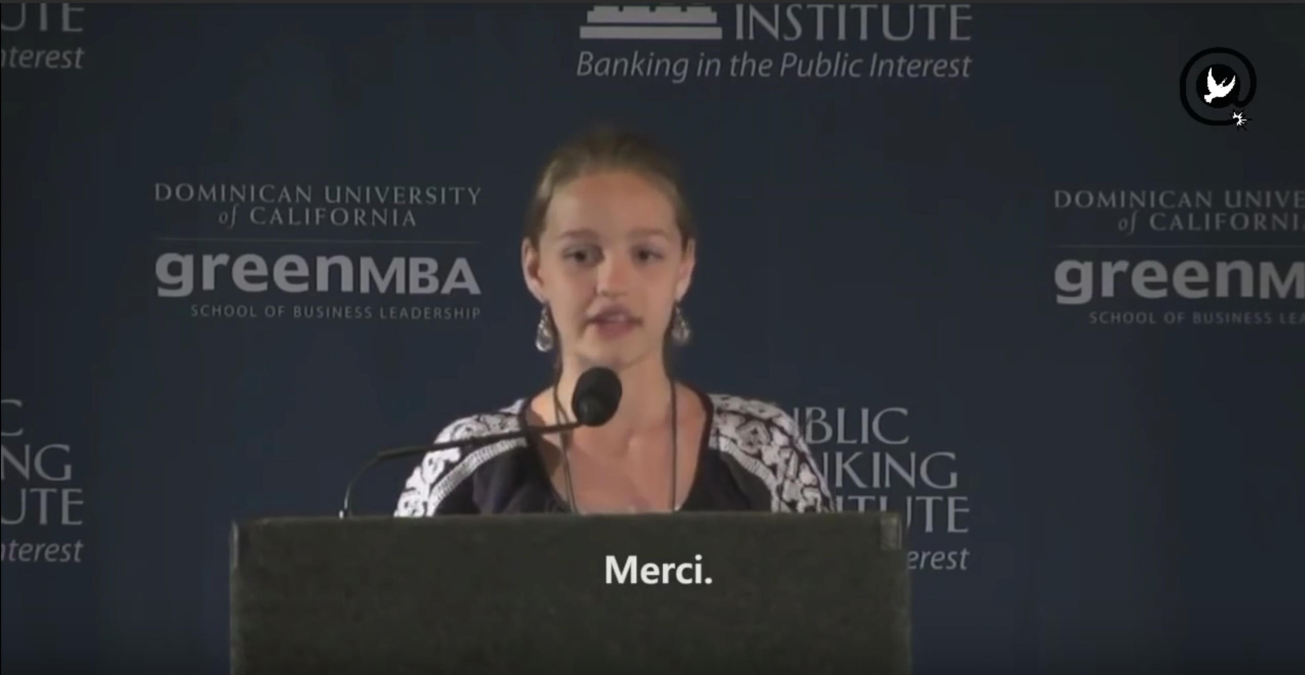Voici l intervention de victoria grant, cette jeune fille de 12 ans en 2012) qui a fait grand bruit par sa vision simple claire et juste de l escroquerie planétaire de notre réalité économique victoria a conscience depuis son plus jeune âge que le pouvoir de l argent et de ceux qui le détiennent est décisif pour le destin de l humanité sa préoccupation englobe autour hui le développement des guerres actuelles qui sont essentiellement provoquées et entretenue par les banquiers et les industriels pour les profits qu ils en retirent ce qui lui fait dire simplement : "l argent dirige les guerres et les banques procurent cet argent